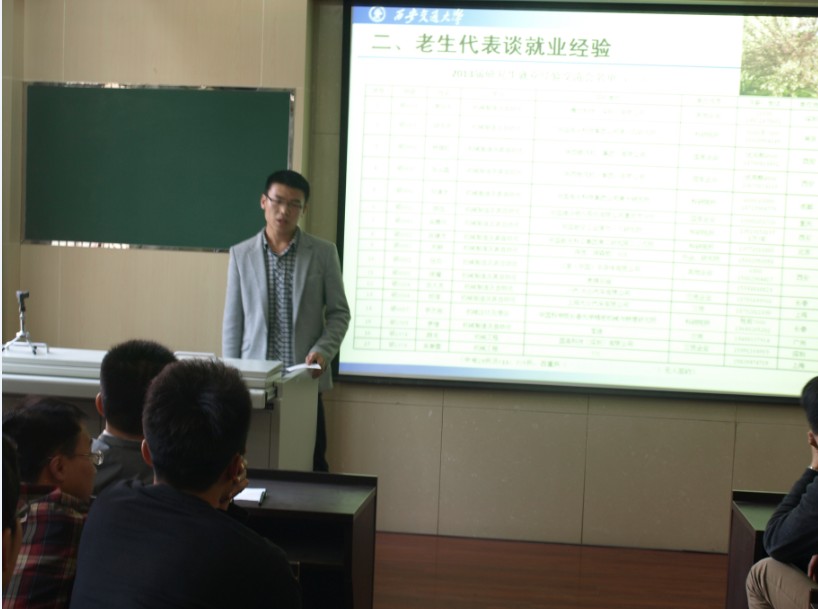 在交通大学电气机械学科将迎来百年华诞之际,2013年3月27日下午,36365线路检测中心2013届研究生就业经验交流会在36365线路检测中心第三会议室成功举行。15位2013届毕业研究生和百余人低年级研究生齐聚一堂,会议由36365线路检测中心研工办雷励老师主持。