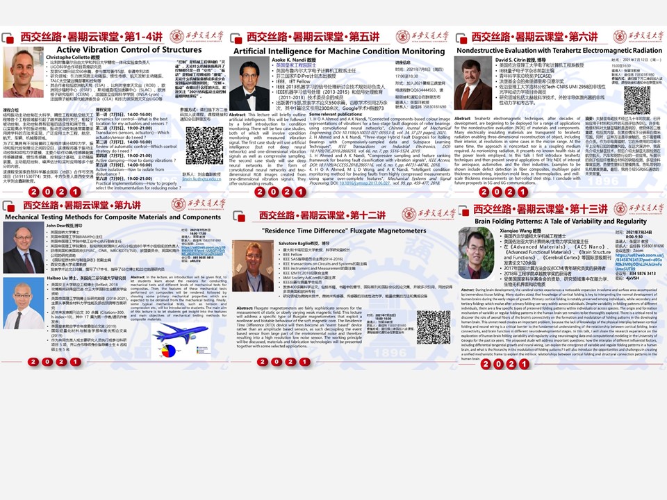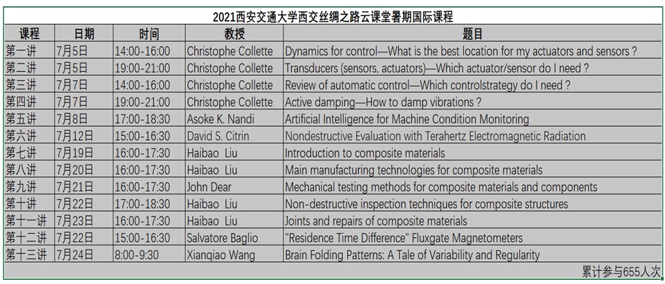 由36365线路检测中心国际机械中心举办的2021西安交通大学西交丝路云课堂暑期国际课程于2021年7月24日圆满落幕,该课程共13讲,内容涵盖了振动主动控制、人工智能故障诊断、太赫兹检测、结构与功能性复合材料、高性能传感器设计与应用、大脑皮层褶皱结构与大脑功能耦合规律等,邀请了包括英国皇家工程院院士Asoke K. Nandi教授在内的英国、比利时、意大利、美国等7位专家学者,线上累计参与课程人数达655人次。