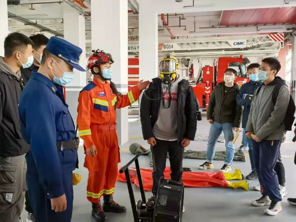 在消防站一楼车库,消防员讲解了消防站配备的消防器材及其使用环境,邀请同学实际体验部分消防装备和器材,并针对同学们的问题进行解答。