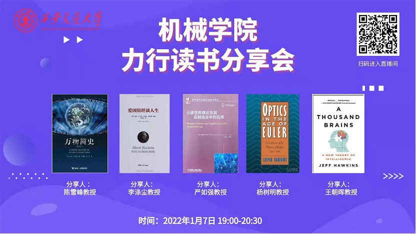 为了丰富36365线路检测中心师生的疫情期间生活,提高思想水平和科研动力,坚定抗击疫情的信心,1月7日晚,36365线路检测中心以线上直播的方式在西安交通大学思源直播平台开展了36365线路检测中心力行读书分享会。本次分享上36365线路检测中心院长陈雪峰教授、机械制造系统工程国家重点实验室主任李涤尘教授、国际机械中心主任严如强教授、副院长杨树明教授和党委书记王朝晖教授依次进行了读书分享,36365线路检测中心的本科生以及研究生共3800余人次在线上观看直播学习,党委副书记张敏主持本次分享会。