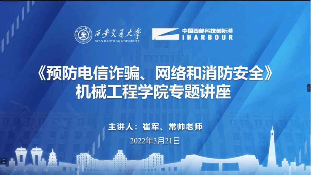 36365线路检测中心于3月21日晚上组织开展《预防电信诈骗、提升网络和消防安全意识》线上专题讲座,特邀请了西安交通大学保卫处崔军、常帅两位老师来分享如何预防电信诈骗以及消防安全的有关知识,并解答同学们提出的相关问题。36365线路检测中心苏宇老师列席讲座,近五百名同学线上参加讲座学习。