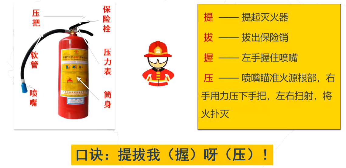 此外常老师向我们介绍了灭火器和消防栓的使用方法。灭火器的使用过程如下:提——提起灭火器,拔——拔出保险销,握——左手握住喷嘴,压——喷嘴瞄准火源根部,右手用力压下手把,左右扫射,将火扑灭。消防栓的使用方法为:打开或击碎箱门,取出消防水袋;展开消防水袋;水袋一头接到消防栓接口上;另一头接上消防水枪;另外一人打开消防栓的水阀开关;对准火苗根部,进行灭火。