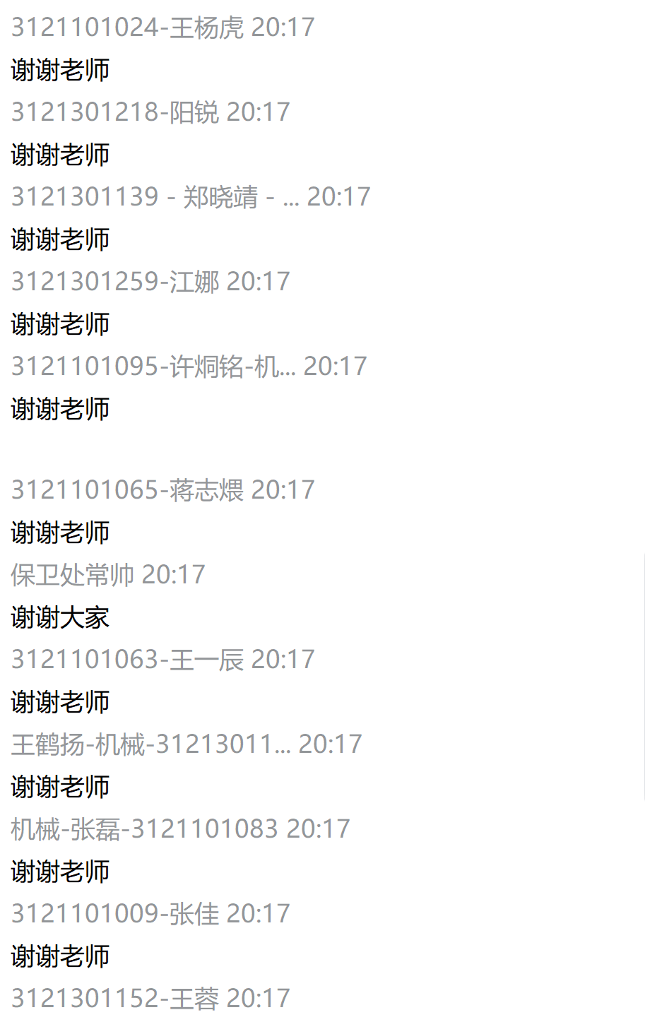 通过本次《预防电信诈骗、网络和消防安全》专题讲座,同学们认识到了电信诈骗的危害以及消防安全的重要性,大家在聊天框纷纷表示了对两位老师的感谢,并分享了自己的感想。