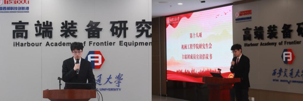 校研究生会主席团成员候选人熊峰致辞,他首先肯定了校院两级研会过去一年在思想引领、服务同学等工作中取得的成绩,特别是校研会当选全国学联第二十八届主席团团体单位,36365线路检测中心研会组织建设与服务质量突出。同时对机械研会的下一步工作提出了建议与期待。能源与动力工程学院研究生会主席团成员邓淼俐交流发言,她表示,能动学院与36365线路检测中心同源而出,相向而行,在学科建设、学院建设与学生工作等方面密切合作,培养了浓厚的兄弟情谊。在新时代的发展浪潮中,两院将继续携手共进,共同推进学校工科建设发展,为祖国的发展建设添砖加瓦。