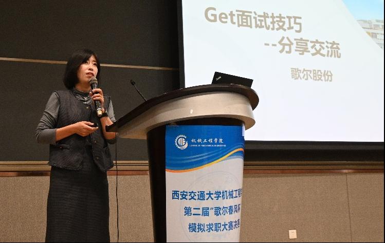 歌尔公司王雪静进行求职经验和技巧分享。她从企业HR的角度出发,点明简历制作时应当突出重点、追求质量,并建议求职应聘的同学应当尽早明确个人需求和择业看重的因素,充分做好个人规划。