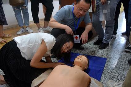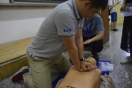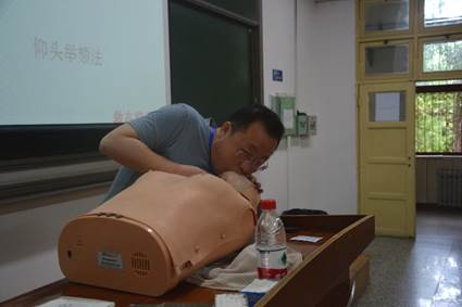 随后,白老师重点介绍了心肺复苏术和实施心肺复苏的各项操作步骤。据卫生部统计,我国每年有50多万人因心跳骤停而死。在心脏停止的4分钟内,是黄金救援时间,如果施予正确的心肺复苏,有50%的患者可以成功复苏。白老师指出,早期、及时、高效的心肺复苏是在各种紧急现场实现救命的关键。