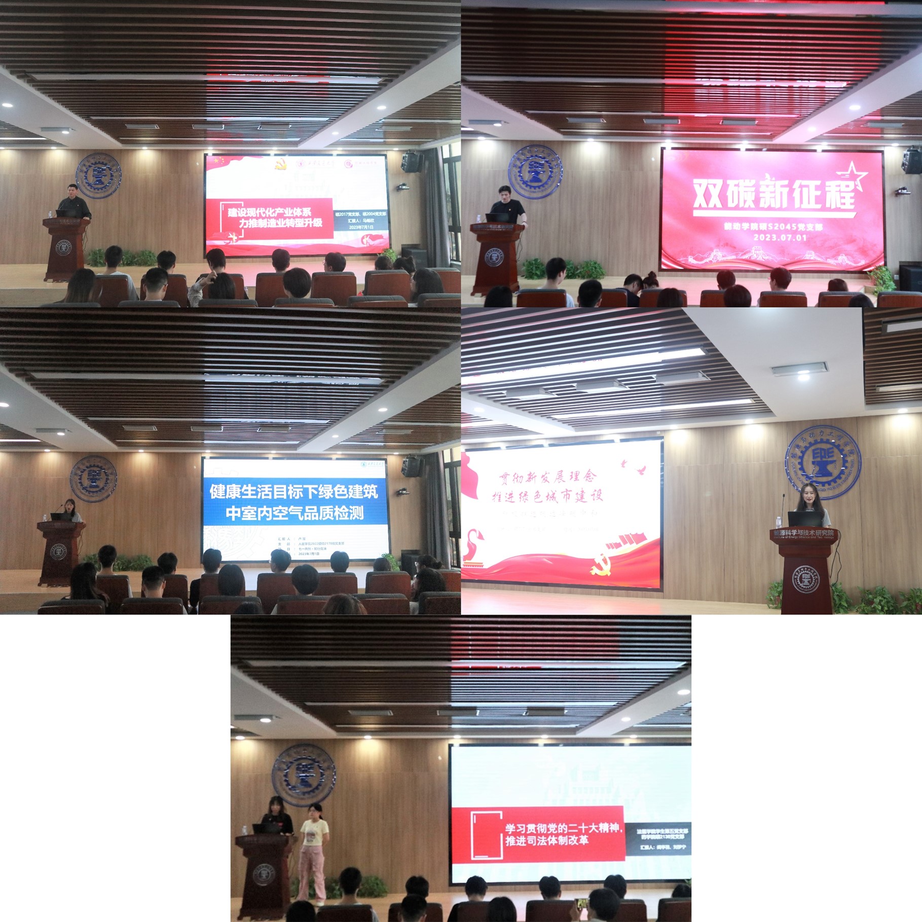 36365线路检测中心硕2017党支部的马畅欣同志代表硕2017党支部和硕2004党支部,从二十大报告中强调的“建设现代化产业体系”出发,围绕《“十四五”智能制造发展规划》解读了制造业未来的关键核心技术攻关方向,介绍了36365线路检测中心以“四个面向”为指引下推动制造业转型升级的相关成果与展望,并呼吁各支部共同推进党建引领下的党团支部工作与跨学科交流工作。能动学院硕2045党支部的刘泓炫同志对在“双碳”背景下产业、生产、能源低碳化的浪潮进行了解读,结合能动学科的研究特点,介绍了应对“双碳”目标的技术对策及未来展望方向。人居学院硕2178党支部的卢溜同志对绿色建筑的概念进行阐释,讲述了其探索引导、试行起步、快速成长、细化发展的四个发展阶段,以埃及典型房屋原型为案例,倡导在建筑设计中节能环保低碳理念的充分践行。人居学院硕2179党支部的那甫•其玛同志结合专业特色,从绿色建筑中建筑材料的使用出发,通过剖析西安交通大学七号楼中太阳能光伏装置与毛细空调的建筑设计,聚焦双碳课题,凝练出绿色建筑中环保材料应用的关键要素,提出了以二十大精神内涵为“核心”,以建筑设计、建筑材料创新为“助力器”,践行生态环保理念,促进学科交叉融合,推动双碳工作落地。医学部法医学院学生第五党支部的阎亭羽同志和药学院硕2135党支部的刘梦宁同志从司法体制改革含义、新时代司法体制改革的丰硕成果、党的二十大对司法体制改革的新要求等方面对党的二十大报告中关于司法体制改革的内容进行了介绍和解读。