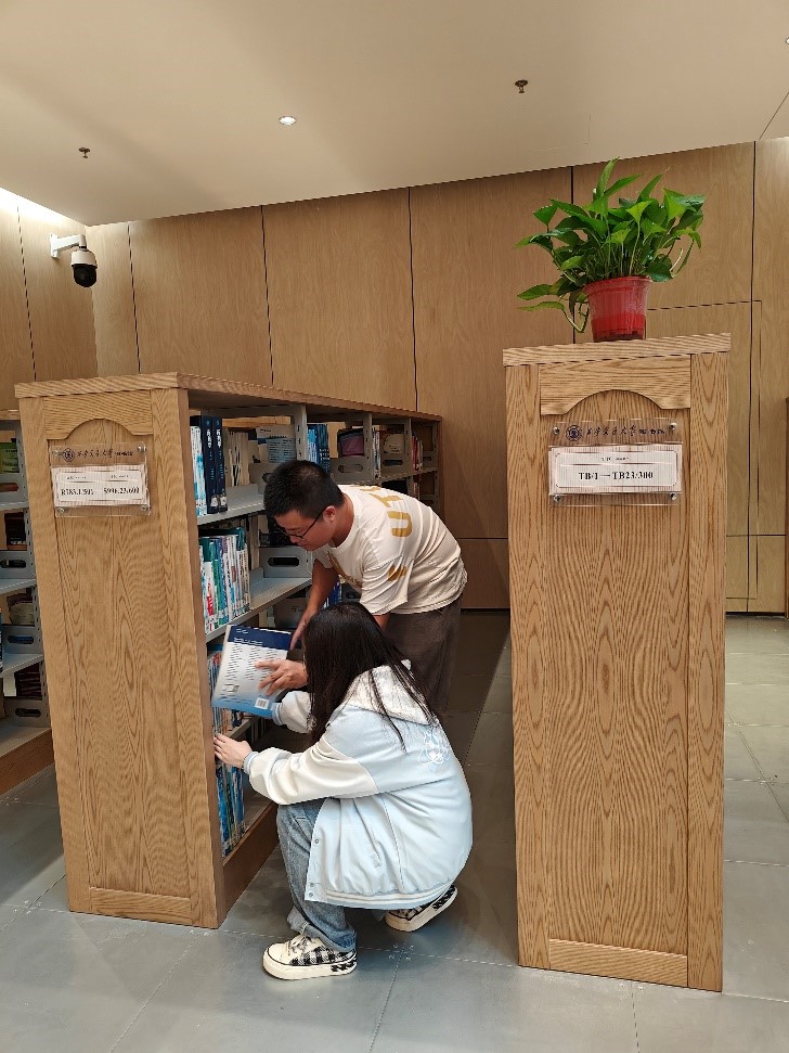 支部同学分成5组,分别对图书馆不同区域的书架进行了检查整理,不仅放入了刚被归还还未被上架的书籍,还挑出了被随意摆放的书籍重新上架。