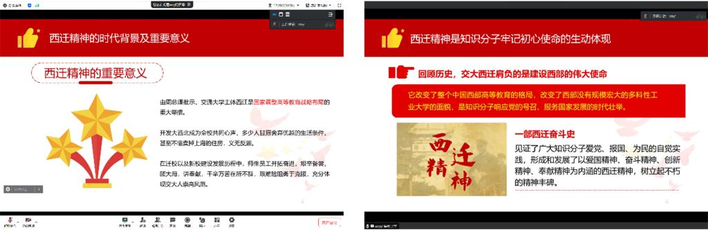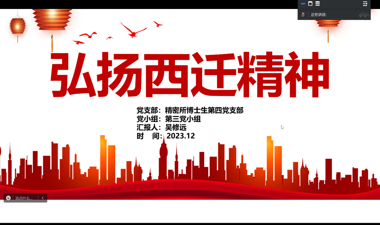 2005年12月6日,经校党委会议审议批准,交大“西迁精神”概括为“胸怀大局,无私奉献,弘扬传统,艰苦创业”16个字。“西迁精神”不仅是交大人的精神财富,更是全体中国人民的共同财富。2020年4月22日,习近平总书记在考察西安交通大学时勉励广大师生,大力弘扬“西迁精神”,抓住新时代新机遇,到祖国最需要的地方建功立业,在新征程上创造属于我们这代人的历史功绩。为深入学习贯彻“西迁精神”,进一步教育引导党员同志不忘初心、牢记使命,精密所博士第四党支部于2023年12月26日通过腾讯会议开展了弘扬“西迁精神”学习教育的主题会议,并进行了本批次党支部预备党员转正工作。本次会议由党支部书记张泽主持,全体党员参与。