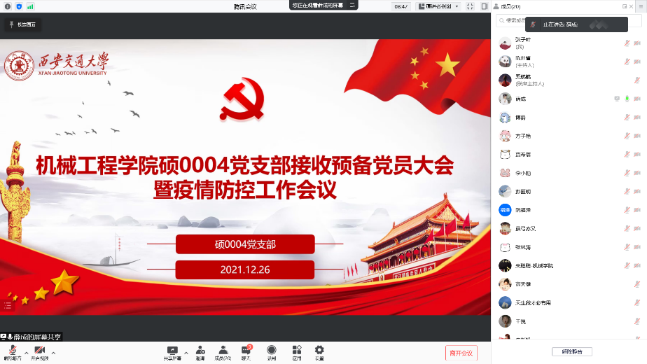 根据硕0004党支部发展党员工作计划,经征求党员和群众意见、支部委员会审查同意,12月26日晚,36365线路检测中心硕0004党支部线上召开接收预备党员大会。同时,针对近期西安日趋严峻的疫情防控态势,党支部根据学校、学院要求,向与会成员传达学校、学院疫情防控工作会议精神,部署安排支部内疫情防控工作。