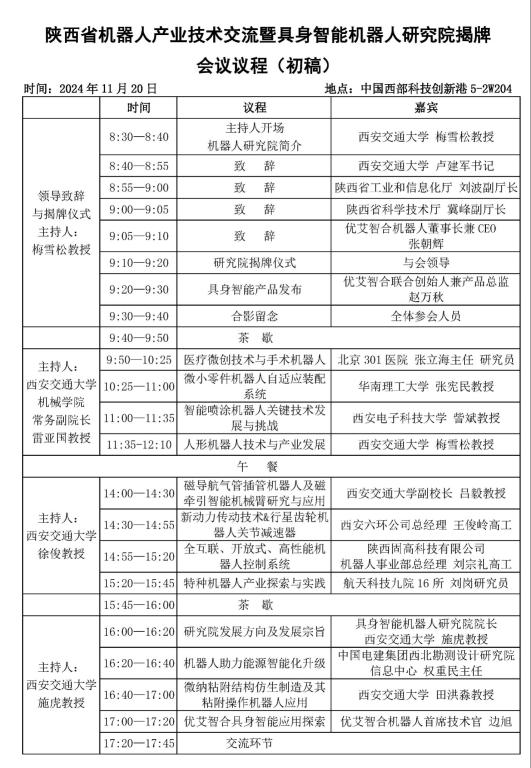 本次优艾智合-西安交大具身智能机器人研究院揭牌暨机器人技术交流会议暂定于11月20日8:30在中国西部科技创新港5-2W204举办,拟邀请两院院士、省市领导、产业重点企业代表等100多位嘉宾出席。