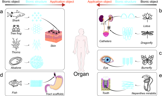 研究表明,借助不同的3D打印技术,可以实现对植入体表面微观结构的精确控制。例如,激光辅助打印技术可用于制作复杂的微观功能结构,从而实现例如减少水动力阻力的鲨鱼皮样结构,这对于心血管植入物来说可显著降低血流阻力并提升血液相容性。此外,研究还展示了通过表面微结构的调控,可以实现超疏水、抗菌、自清洁等功能,从而提高植入体在生物环境中的稳定性(如图2)。此次研究创新性地将多种仿生表面设计与3D打印技术相结合,为未来新型生物医学植入物的研发提供了新的思路,也为生物打印领域在精确制造、功能优化以及长期生物兼容性等方面提供了宝贵的实验数据和理论支持。研究团队表示,未来将进一步探索这些仿生结构在实际医学应用中的可行性,为再生医学及个性化医疗设备的发展贡献力量。