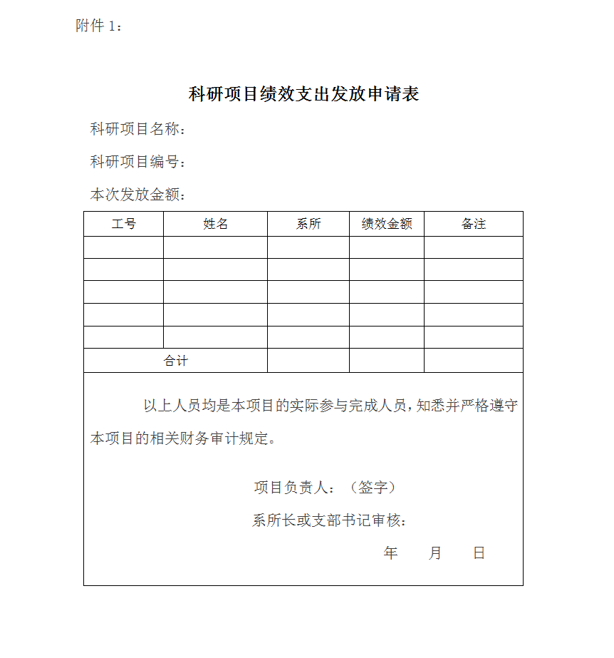2、科研项目负责人填写《科研项目绩效支出发放申请表》见附件1),系所长或支部书记审核签字;