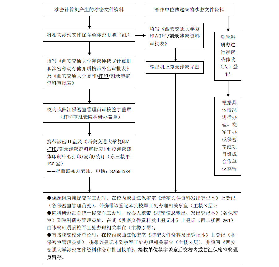 涉密资料销毁:项目结题、项目申报过程中产生、项目答辩完退回等涉密载体需进行销毁时,原则上由产生部门进行登记暂存或销毁;外单位发来或院科研办统一提交军工办退回的涉密载体销毁时,院科研办进行登记暂存或销毁。暂存涉密资料,在校保密办办理集中销毁时,由各处管理员移交校保密办销毁,移交清单各处留存。