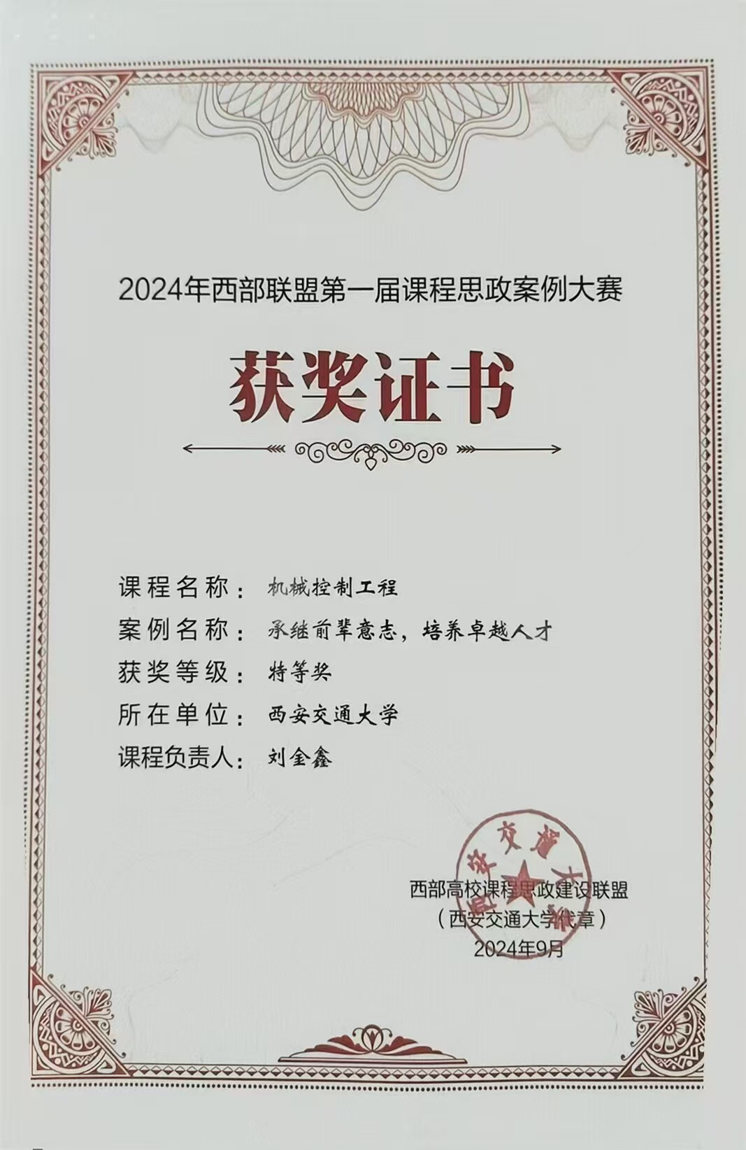 将课程思政纳入教师教学能力培训内容体系,并作为师德师风建设的重要抓手,不断加大对课程思政重点、难点的研究力度,全面提升教师课程思政教学水平。获批省级课程思政精品课程(本科)1门,入选校级课程思政示范专业 1 个(机械工程),校级课程思政示范本科课27门。教师多次在相关教学竞赛中取得优异成绩:刘金鑫荣获 2024 年西部联盟第一届课程思政案例大赛特等奖;李宝童、曹宏瑞、权双璐等先后在学校课程思政“百名教师大练兵”中获特等奖、一等奖。